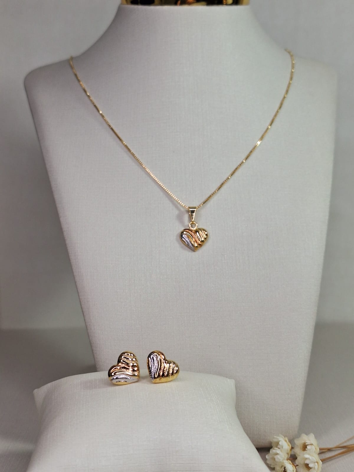 O pingente em forma de coração traz um toque romântico e atemporal, enquanto o acabamento em três tonalidades de ouro cria um visual moderno e harmonioso. Os brincos complementam o conjunto com o mesmo design elegante, proporcionando um look delicado, discreto e encantador. Ideal para presentear ou celebrar momentos especiais.